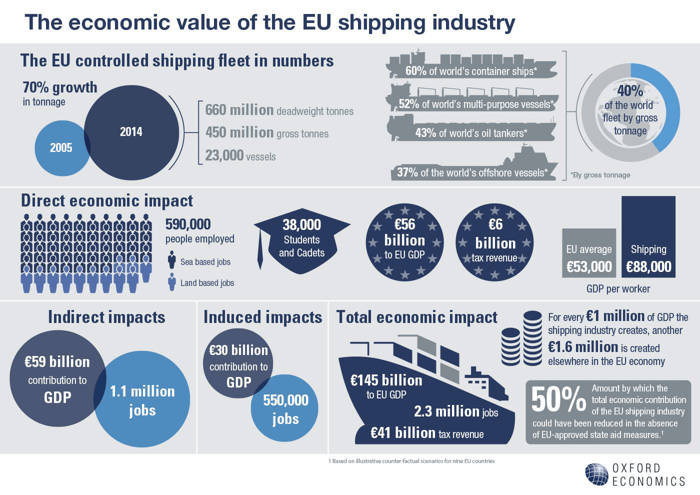 Το γεγονός αυτό τεκμηριώνεται επίσης από τις στατιστικές της ΕΕ, η οποία το 2014 κατείχε το 40% του παγκοσμίου στόλου με κριτήριο την ολική χωρητικότητα (gross tonnage), με την ελληνική ναυτιλία να υπολογίζεται γύρω στο 50% της ευρωπαϊκής. Ο άμεσος τζίρος της ΕΕ ήταν 56 δις €, τα άμεσα φορολογικά έσοδα 6 δις €, ενώ ο συνολικός τζίρος, άμεσος και έμμεσος (για κάθε 1 € άμεσου δημιουργείται 1,6 € έμμεσου, σύμφωνα με μελέτη της Oxford Economics – γράφημα) 145 δις €.